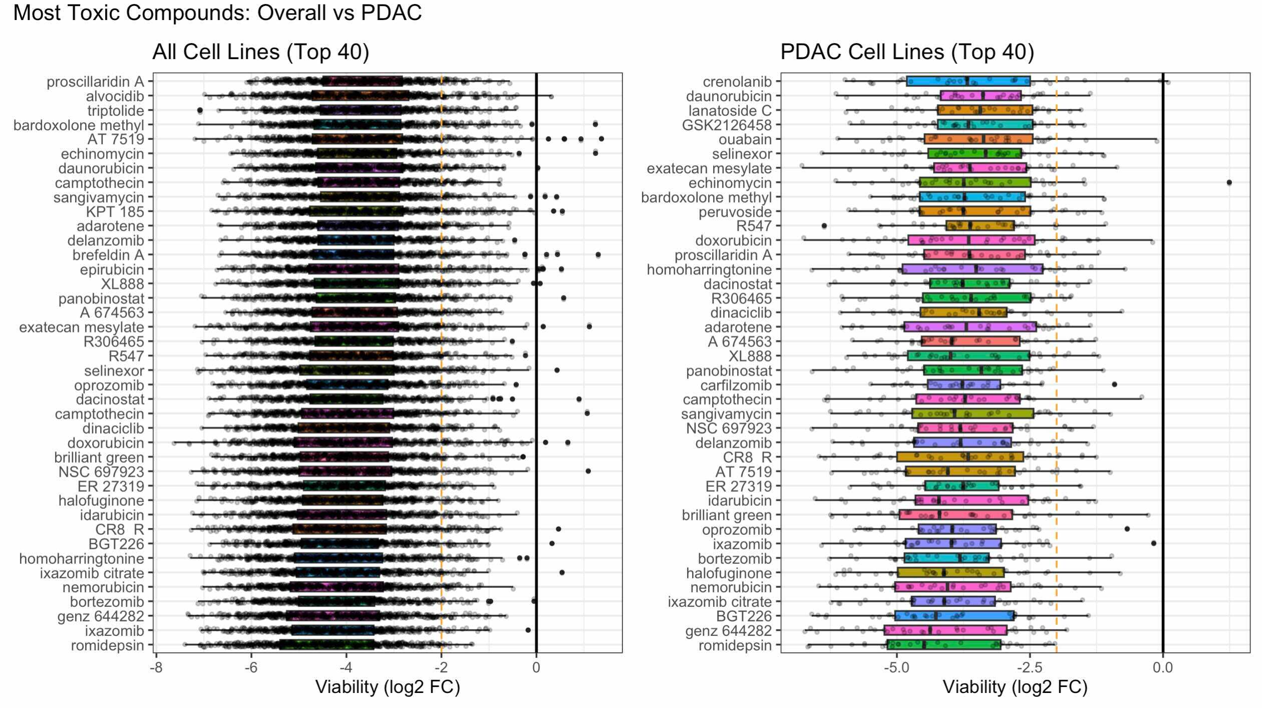 Using DepMap screening data (hundreds of cancer cell lines screened with hundreds of drugs), I plotted the most potent 40 compounds both overall, and in a ‘difficult to treat’ tumor. Camptothecin (TOPOi) is pretty high up, but there are certainly other mechanisms that could be explored and also offer high potency. Proteasome inhibitors, HDAC inhibitors, anthracyclines, and more. When you use an LLM to search these against just the potency and P-gp substrate filter, very few actually come out. This highlights the need for further medicinal chemistry optimization, but also shows that there is a lot of green space!