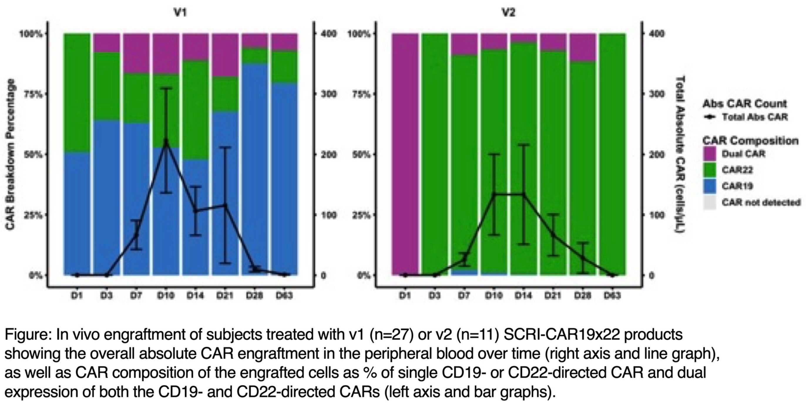 SCRI-CAR19x22v1 is an autologous dual lentivirus transduced CAR-T with both CD19- or CD22-specific CARs, both with 4-1BB co-stimulation. During manufacturing, 42% CD22 only, 33% CD19 and CD22, 3.2% CD19 only CAR-Ts were produced. 91% obtained a CR.