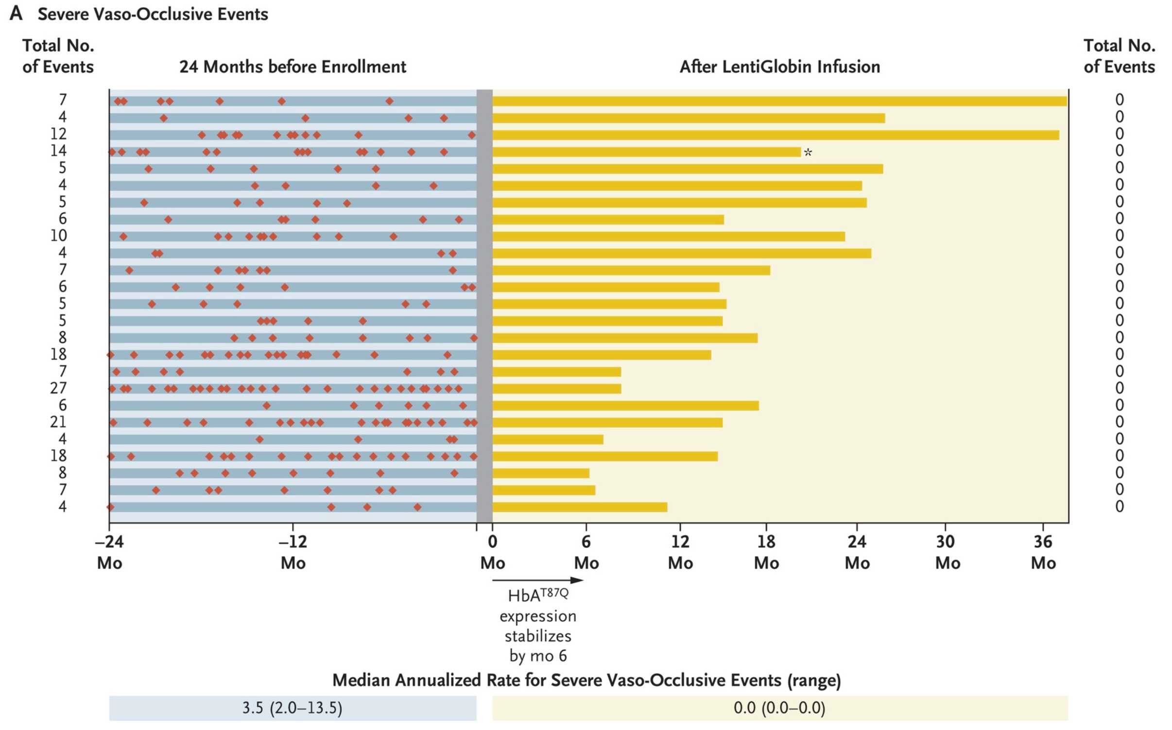 We may also have a functional cure for sickle cell disease. BlueBird Bio’s LentiGlobin (lovotibeglogene autotemcel) reported results at ASH and in NEJM showing spectacular reductions in vaso-occlusive events and improvements in markers of hemolysis, which are symptoms of disease. LentiGlobin is an autologous transplantation of hematopoietic stem and progenitor cells transduced with the BB305 lentiviral vector encoding a modified β-globin gene, which produces an antisickling hemoglobin, HbAT87Q. 25 patients with a history of vaso-occlusive events and were treated with LentiGlobin had complete resolution of severe vaso-occlusive events, leading to the spectacular figure below. Sickle cell is a crowded indication space with multiple gene therapy companies working on it. Potential commercial difficulties aside, an amazing update for patients.