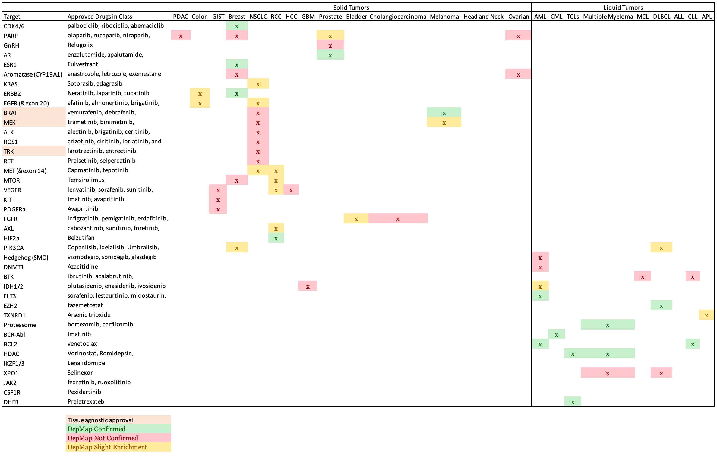 Very simple goal today. I want to know whether DepMap can be used to screen targets for efficacy in certain patient populations. Using a recent catalog of targeted therapy approvals from the FDA, I will calculate the sensitivity of DepMap for verifying the targetability of certain patient populations. If the sensitivity is high enough, we should be able to screen clinical trials in oncology using DepMap to understand probability of success for biomarker driven targeted therapies. This analysis will only consider targeted therapies. Ie. no chemotherapy, immunotherapy, antigen targeted therapies, etc will be considered.