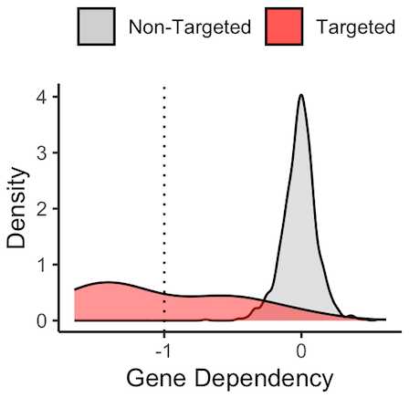 Using this framework, I want to know how many other molecular targets can be confirmed using DepMap’s dependency data. To do this, I will assemble a list of targets and indications from FDA approvals. For each pair, I will calculate the difference in mean dependency in the targeted group and the non-targeted group. ABL1 in CML is a strong example which yielded a difference of around 1 in dependency score. Based on the distribution of dependency score differences from all pairs of target and indications, I will empirically assign a cutoff for difference in dependency score that meaningfully stratifies dependency based on target biomarkers.