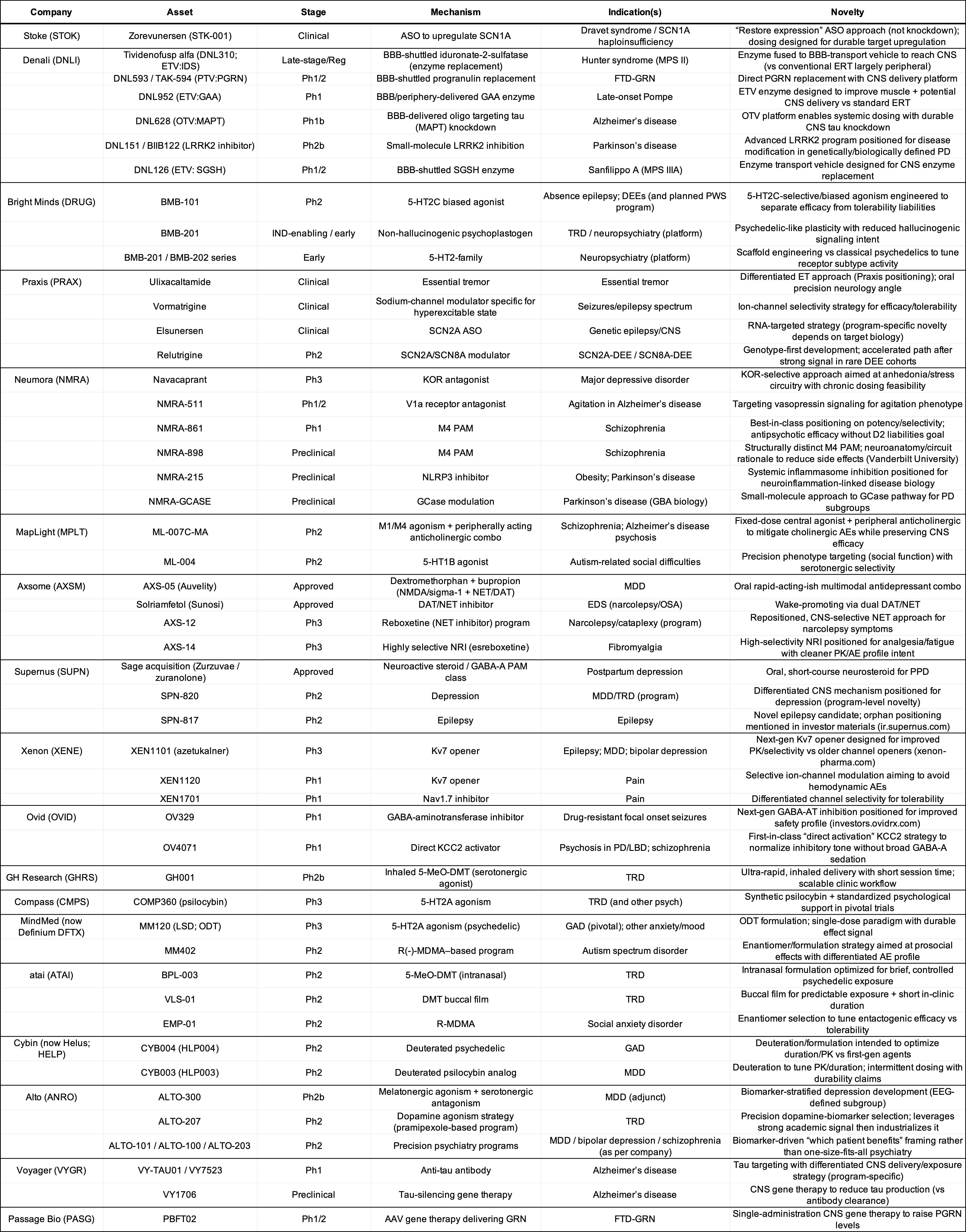 The goal of this post is to more completely understand the mechanisms, indications, and private/public companies that operate and perform clinical experiments in the neuropsychiatric medicines space. I used ChatGPT for much of the work of collecting information and take responsibility for all mistakes.