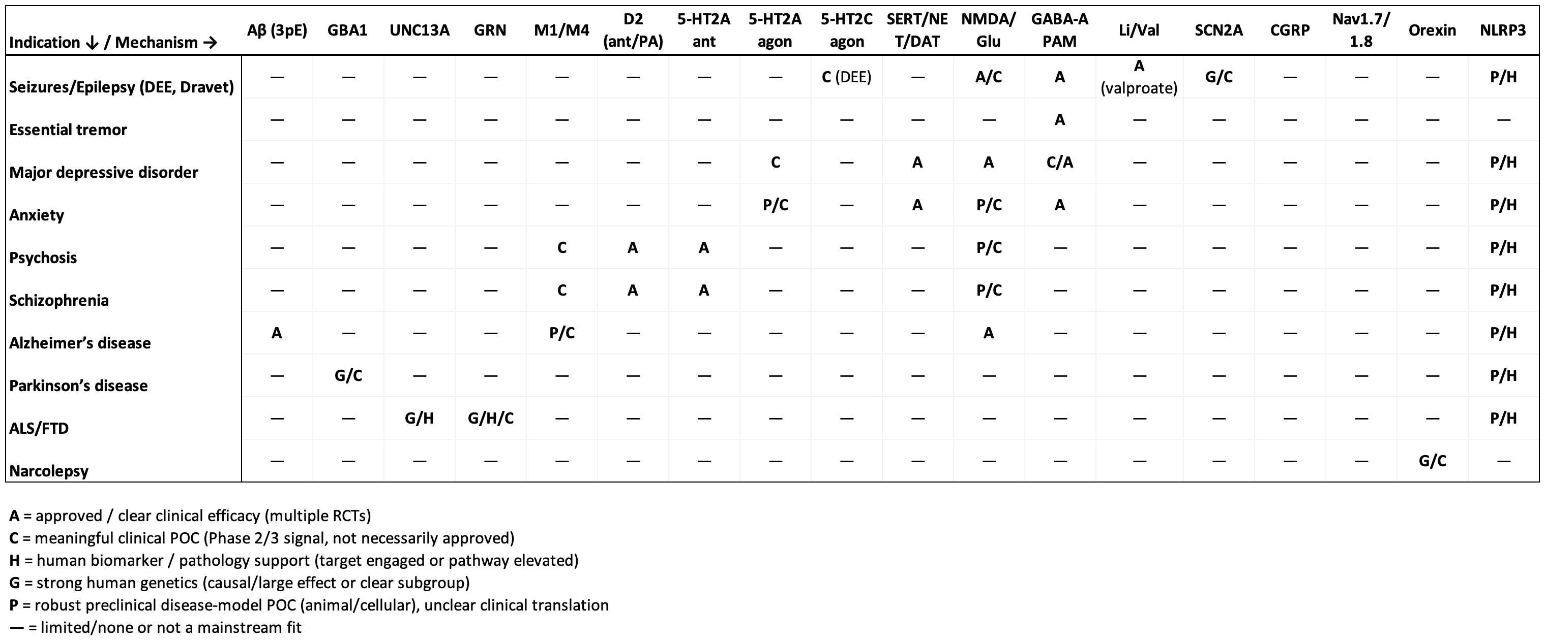 First, I’ll go over the various mechanisms validated to work as evidenced by approved therapy classes and positive proof of concept clinical trials. I bucketed these mechanisms into four buckets which are reflective of the root of disease pathology and approach to symptom management: 1. Addressing misfolded/mislocalized protein 2. Targeting neural circuitry by activating/inhibiting specific neuron populations 3. Neuroplastogens 4. Neuromodulators that change baseline activity across the brain.