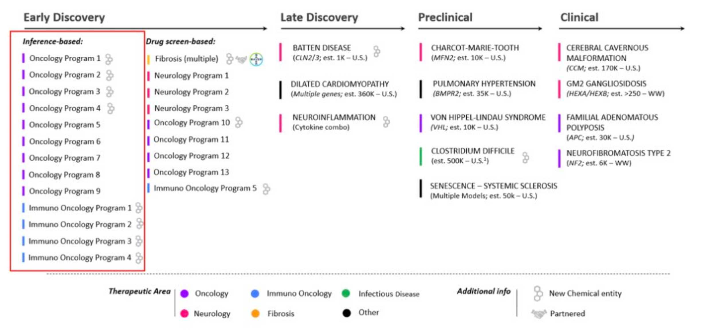 In July 2019, the company raised a 121 million series C at a valuation of $646 million. Recently in September 2020, the company announced a $239 million series D at a valuation of ~1.24 billion post-money. It was founded in 2013, and just recently over the past 3-4 years has it been operating at full scale, and doubling production YOY. The company has 4 compounds in human clinical trials, which I’ll talk about later. Overall, the company claims to have over 30 programs in its pipeline, along with programs developed jointly with large pharmaceutical partners. They have 200 employees, roughly half split between bench and data scientists/engineers.