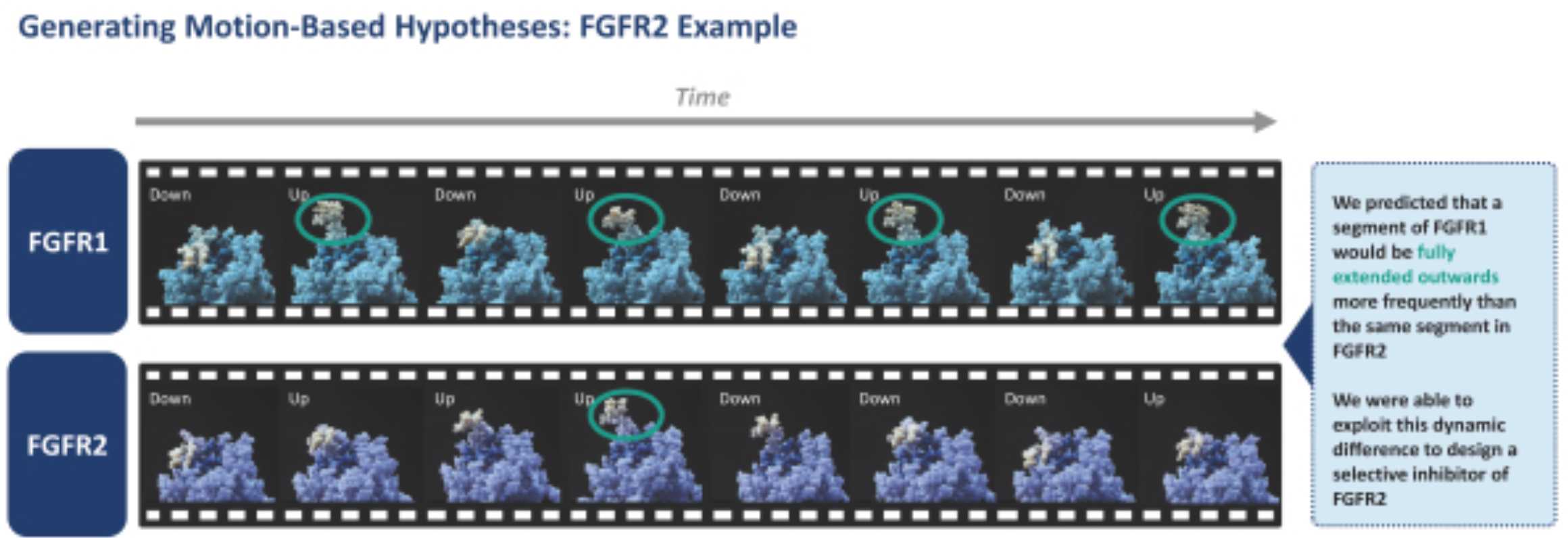 Using these simulations, a motion picture of the protein can be stitched together, and Relay scientists can develop hypotheses about how the protein functions. For example, in the slide below, they describe how they developed a hypothesis for their FGFR2 inhibitor: