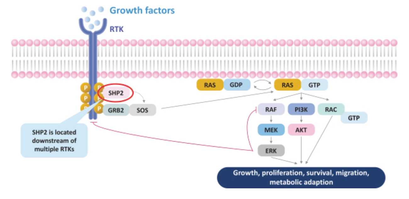 SHP2 is involved downstream of other common RTK targets pictured above, and thus represents a common node to address bypass resistance, a phenomena where cancers will evolve mutations to reduce dependency on a particular pathway targeted by a therapeutic. For example, MEK inhibitors can fail after tumors shift growth factor signaling to alternate RTKs to reduce sensitivity to such therapies. As a result, Relay has successfully demonstrated synergies between their SHP2 inhibitor and other targeted therapies targeting KRAS and ALK.