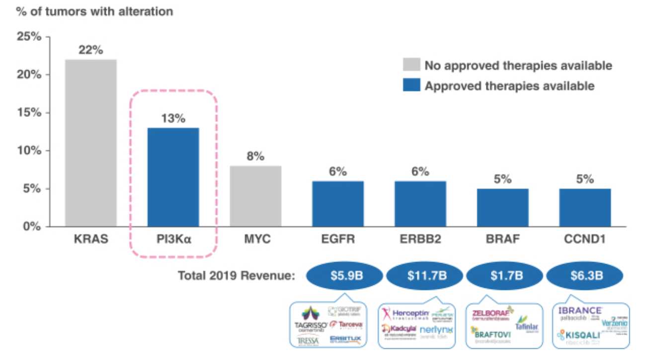Finally, Relay wants to develop a franchise of PI3K mutant inhibitors. Phosphoinositide 3-kinase alpha (PI3Kα) is overactive in many cancerous malignancies, and acts downstream of tyrosine kinases like RAS to promote cell growth, proliferation, and survival. PI3Kα mutants are present in 13% of all solid tumors, but is difficult to drug. The one FDA approved PI3Kα inhibitor Alpelisib (Piqray) is used for breast cancer but comes with significant toxicity.