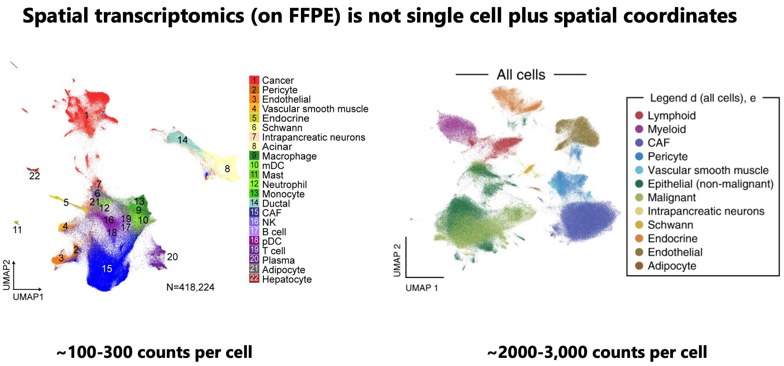 Your counts are going to determine how confident you are in the annotation you create. Not only is separation of clusters more difficult, the risk of miscalling cells that don’t have lineage marker transcripts (due to poor sensitivity) is much higher. It is also more difficult to call smaller cells like T cells due to transcript contamination and lower expression of lineage defining genes. If you can’t annotate many cell types, is the annotation useful? Another consequence of the generally lower count profiles in spatial transcriptomics is that porting a lot of single cell methods to spatial transcriptomics does not have a lot of utility. Things like trajectory inference, unsupervised clustering, and even simple stuff like differential expression, are highly influenced by your counts per cell.