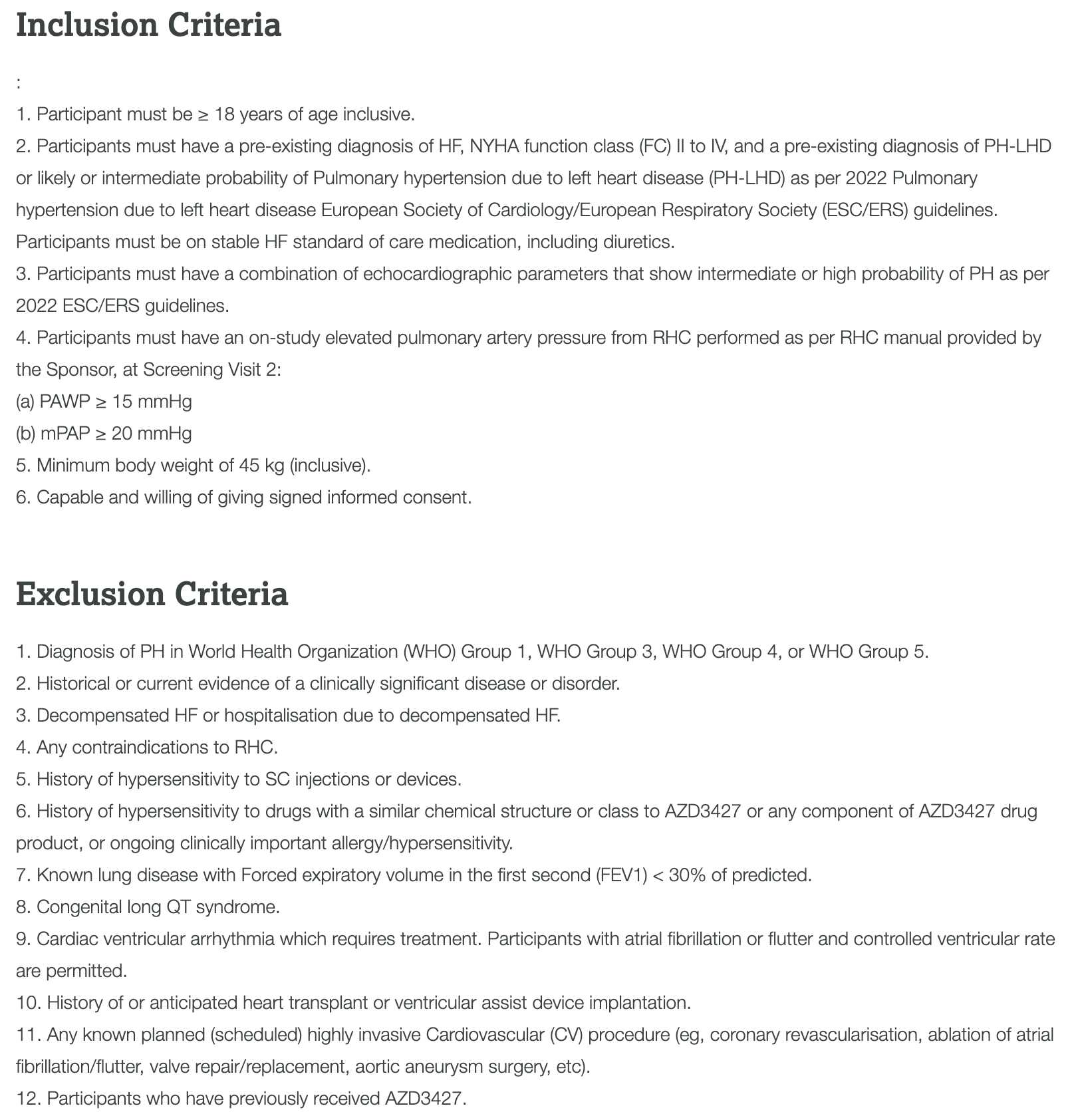 The AZD3427 and TX45 trials focus on a specific Group 2 PH with HFpEF population with stable medication. They exclude patients who have decompensated HF or recent hospitalizations due to decompensated HF.