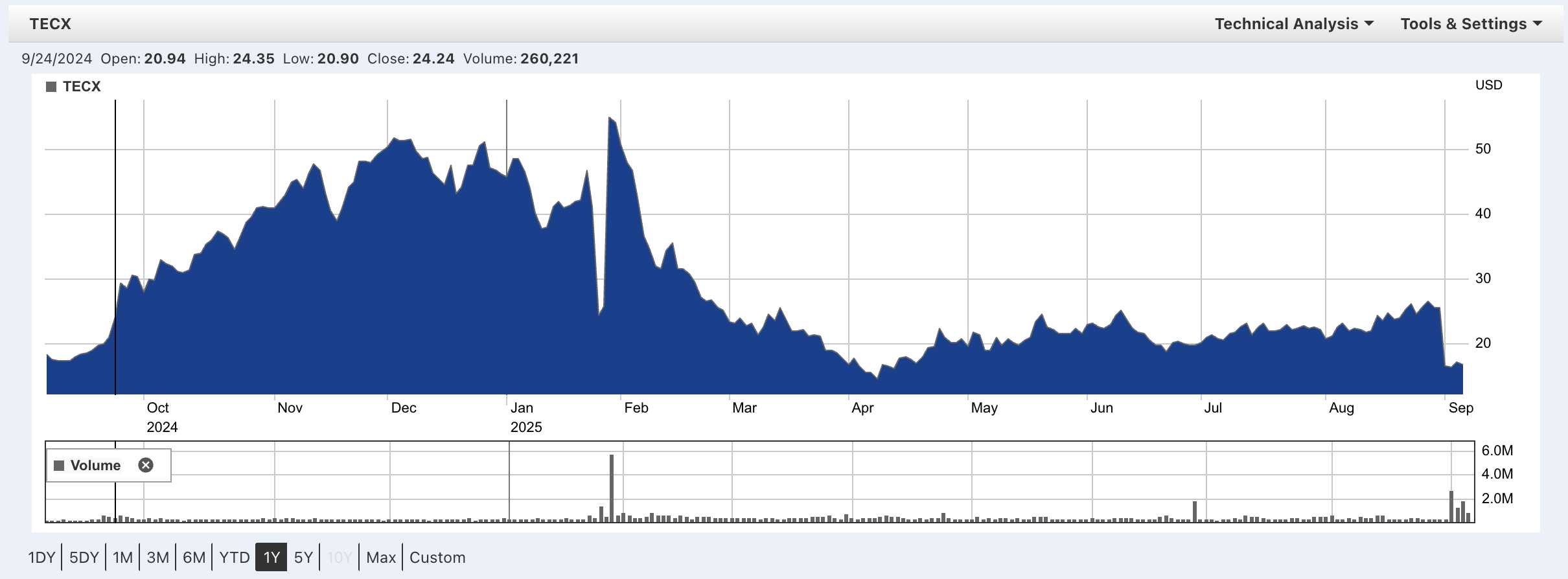The catch is that Lilly discontinued theirs in both heart failure and chronic kidney disease after a trial in a broad heart failure population not only failed to show benefit, but actually showed even worse outcomes on the relaxin drug than on placebo. News of this in January dropped TECX stock by ~50% from mid 40s to mid 20s. Just days later when TECX reported interim Ph1 data from their Ph1b trial, TECX stock rocketed back up, higher than before the Lilly news in the mid 50s. Over the course of Q1, the stock dribbled down and reached a low April 8th at low teens, before steadily climbing back up to the mid-20s. A Nature Medicine paper describing the full results of Lilly’s trials leading to discontinuation was published on August 31st, leading to yet another ~35% move down into the 16s.