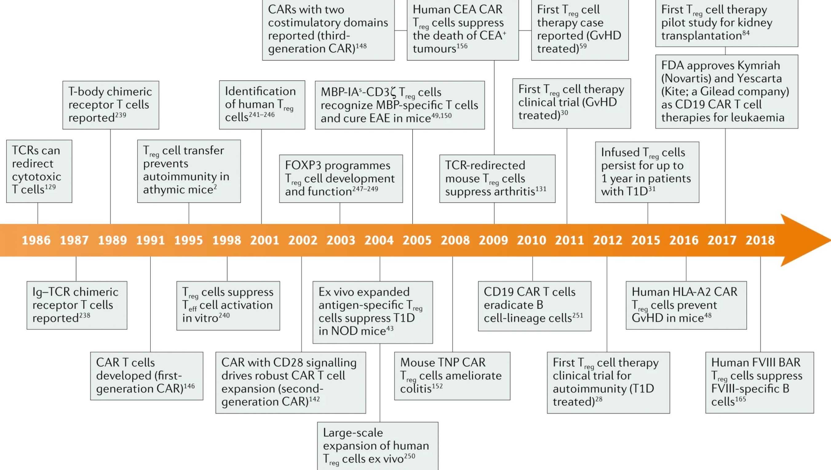 Tregs are 20 years behind the rest of the engineered T cell field, and we don’t necessarily have a lot of the basic science background to base decisions on. The first clinical trial evaluating Treg therapy in humans was published in 2009 and there hasn’t been that much progress since then because of the difficulty of manufacturing Treg cells and selecting and recruiting patients. Still, the tremendous successs of cell therapy in hematological malignancies has perhaps spurred a newfound interest in conjunction with strategies to overcome manufacturing difficulties. The timeline for Treg based therapy has been long, but is just beginning to mature.